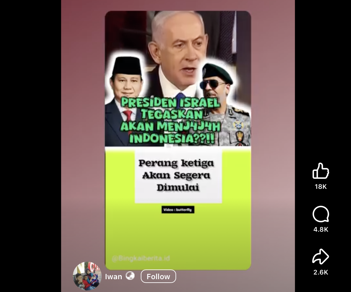 ZONAUTARA.com – Beredar video yang di unggah di media sosial Facebook, menyebut Perdana Menteri Israel Benjamin Netanyahu akan menyerang negara Asia salah satunya Indonesia sebagai target berikutnya setelah Iran.