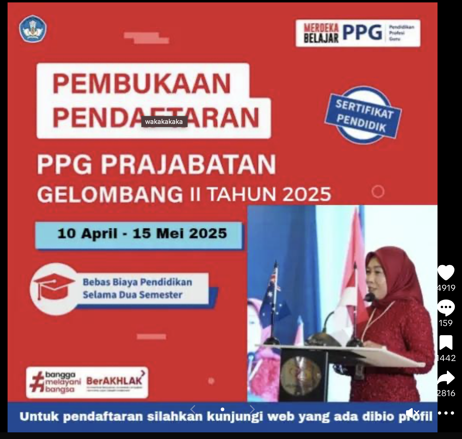 ZONAUTARA.com – Sebuah akun TikTok “pendidikan.profes” mengunggah video yang mengklaim bahwa pendaftaran PPG Prajabatan Gelombang II Tahun 2025 telah dibuka. Dalam video tersebut, ditampilkan poster bergaya resmi dari Kemendikbudristek yang mencantumkan periode pendaftaran dari 10 April hingga 15 Mei 2025. Poster itu juga menampilkan gambar seorang pejabat perempuan dari Kemendikbudristek untuk menambah kesan resmi. Tautan untuk pendaftaran disebutkan tersedia di bio profil akun tersebut.