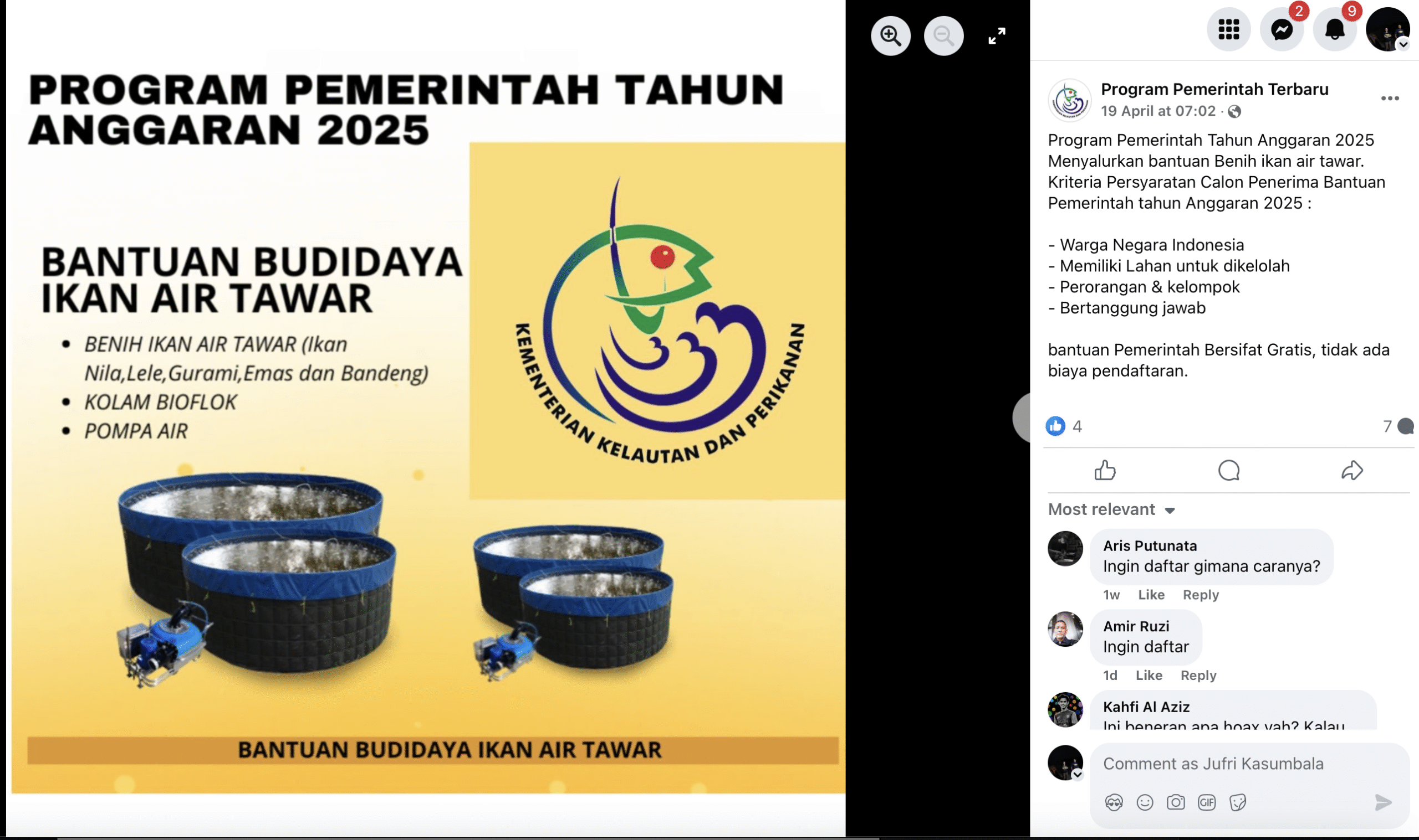 ZONAUTARA.com – Ramai di media sosial, akun-akun Facebook menawarkan bantuan benih ikan air tawar dari Kementerian Kelautan dan Perikanan (KKP) pada periode April 2025.