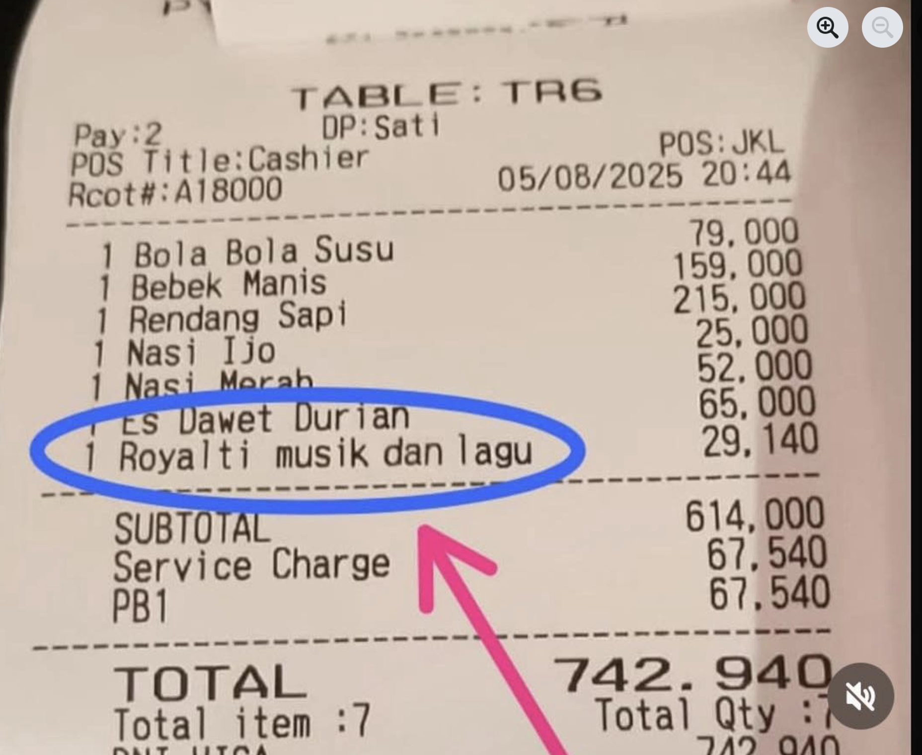ZONAUTARA.com – Di media sosial ramai beredar foto sebuah struk restoran yang mencantumkan biaya royalti musik dan lagu sebesar Rp 29.140.
