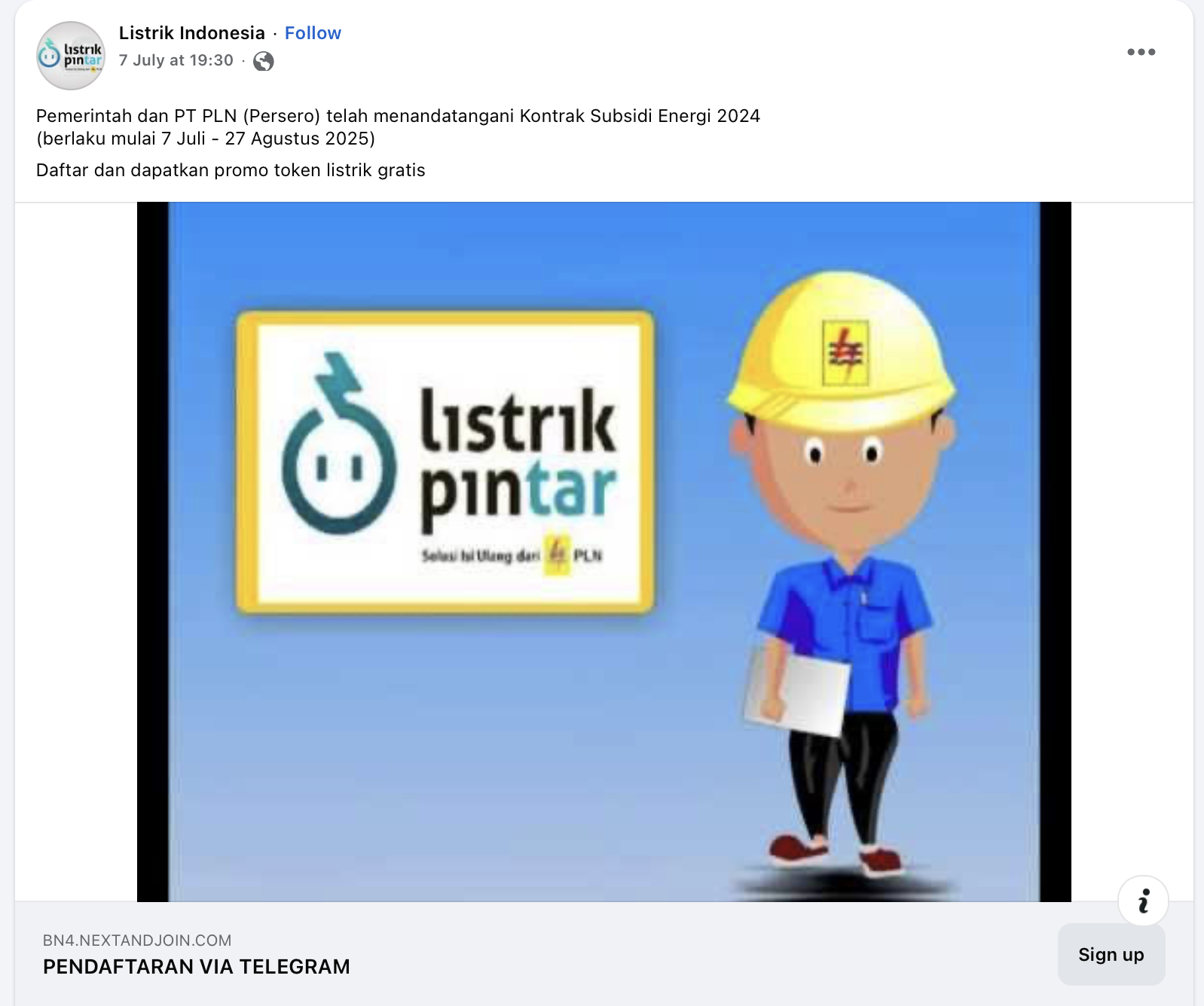 ZONAUTARA.com – Sebuah klaim beredar di media sosial Facebook menyampaikan PT PLN (Persero) telah menandatangani subsidi energi dan akan memberikan listrik gratis periode 7 Juli – 27 Agustus 2025, pada postingan ini juga disematkan link pendaftaran. Salah satu akun yang mengunggah informasi ini adalah @Listrik Indonesia, meski informasi ini telah banyak dibagikan di media sosial.
