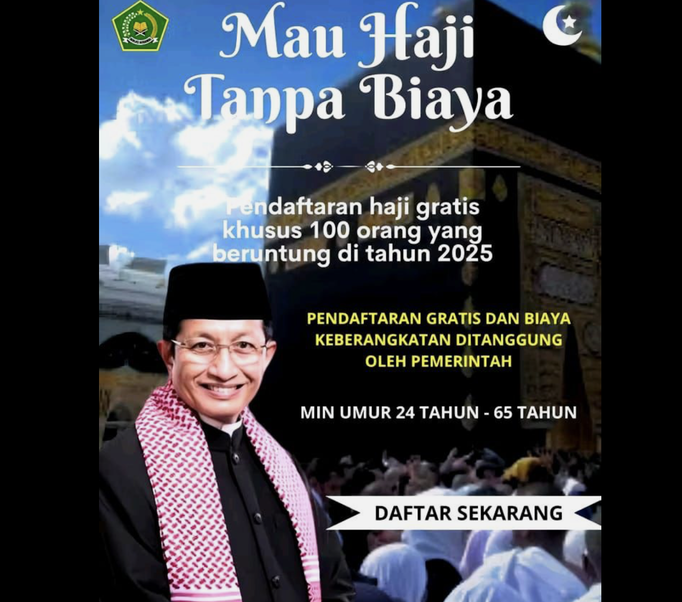 Salah satu unggahan yang terpantau muncul di Facebook pada 10 September 2025 menampilkan tautan pendaftaran yang disebut-sebut berasal dari Kemenag. Dalam postingan itu, pengguna diajak untuk mengisi data pribadi agar bisa ikut dalam “program undian haji gratis tahun 2025”.