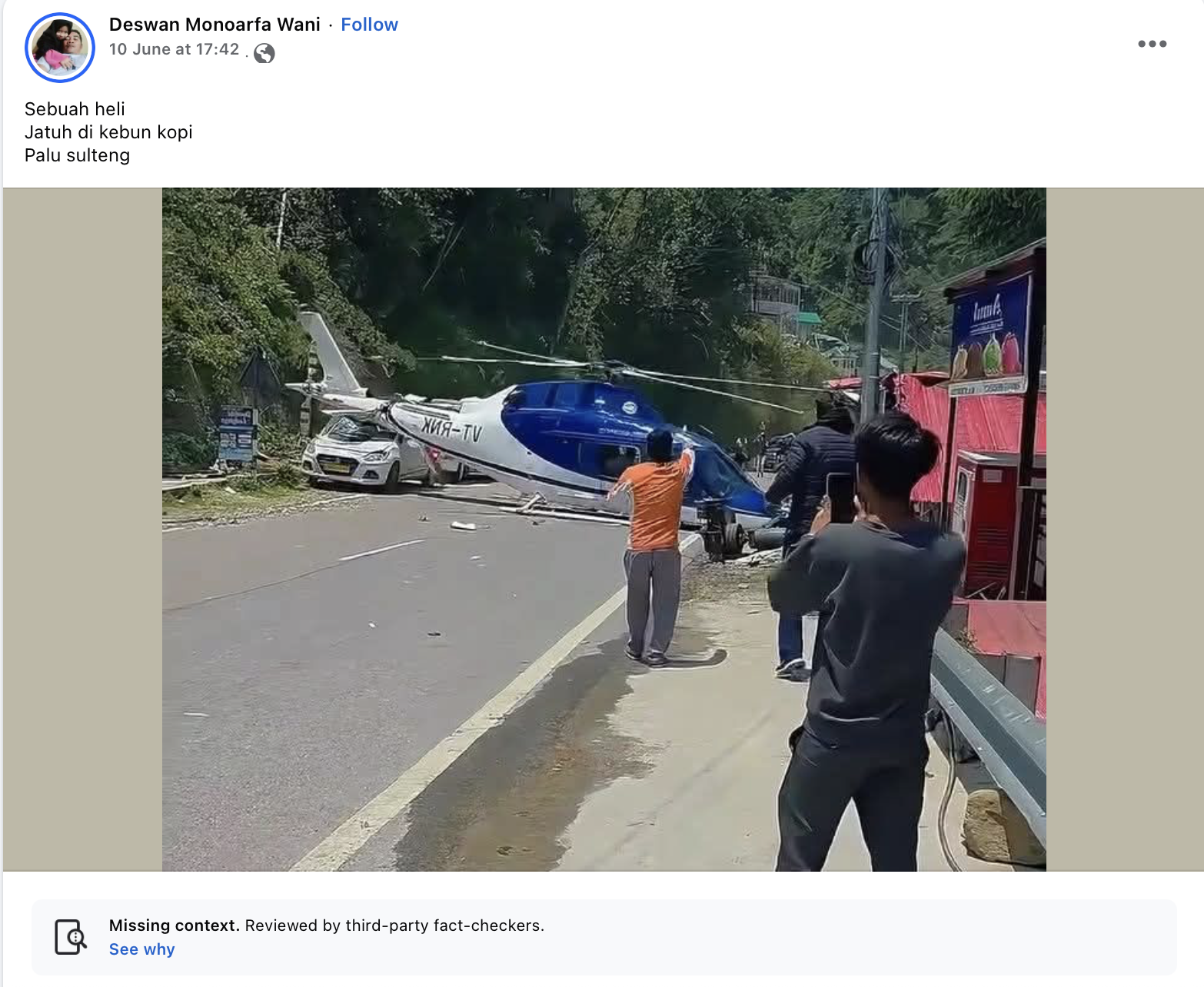 ZONAUTARA.com – Ramai beredar unggahan di media sosial dengan narasi sebuah helikopter terjatuh di Palu, Sulawesi Tengah. Postingan ini menyertakan gambar tangkapan layar sebuah helikopter berwarna biru putih mendarat di atas jalanan aspal dan menimpa sebuah mobil berwarna putih.