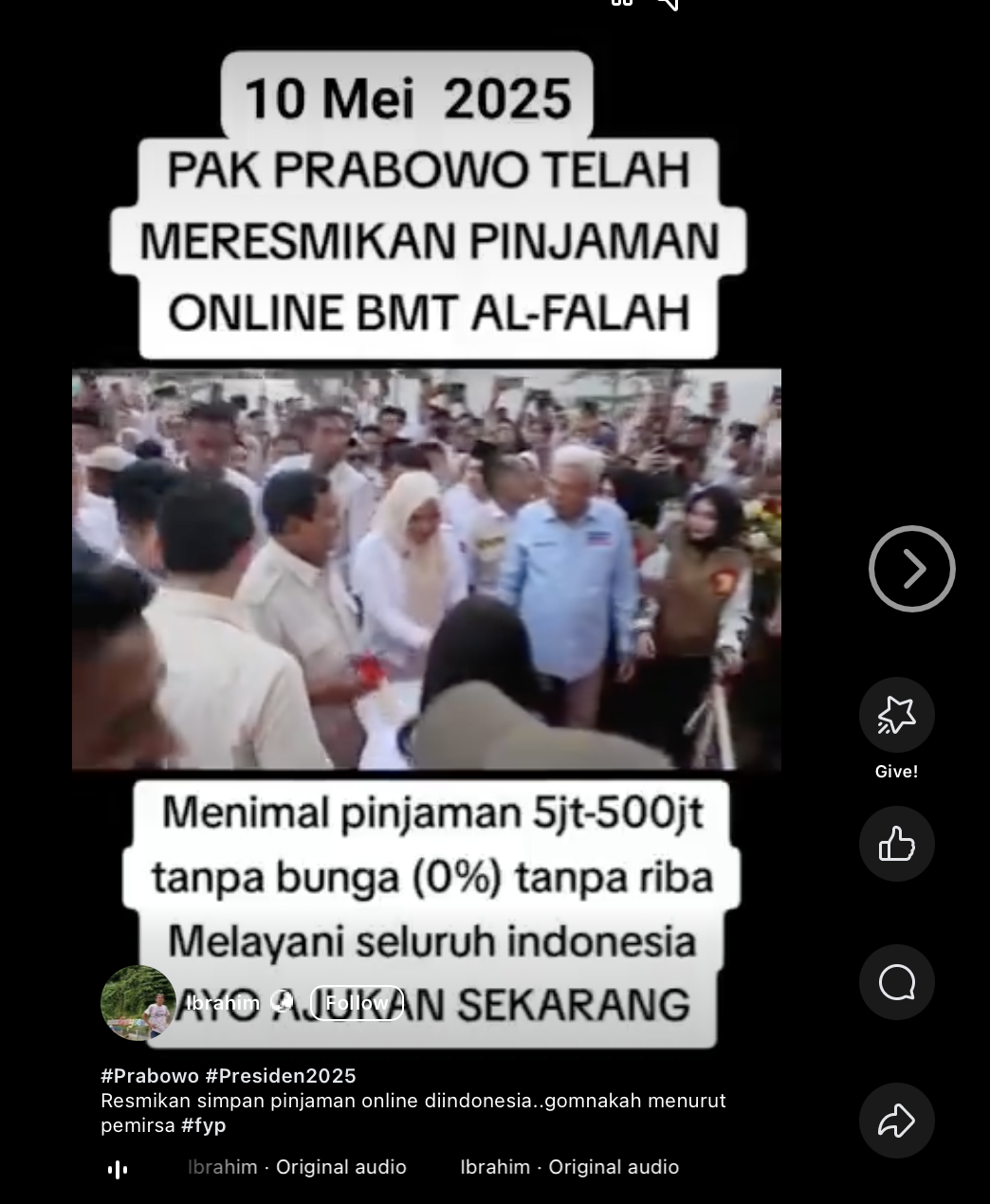 Beredar unggahan video di media sosial dengan narasi Presiden Prabowo Subianto sedang meresmikan perusahaan pinjaman online (pinjol).